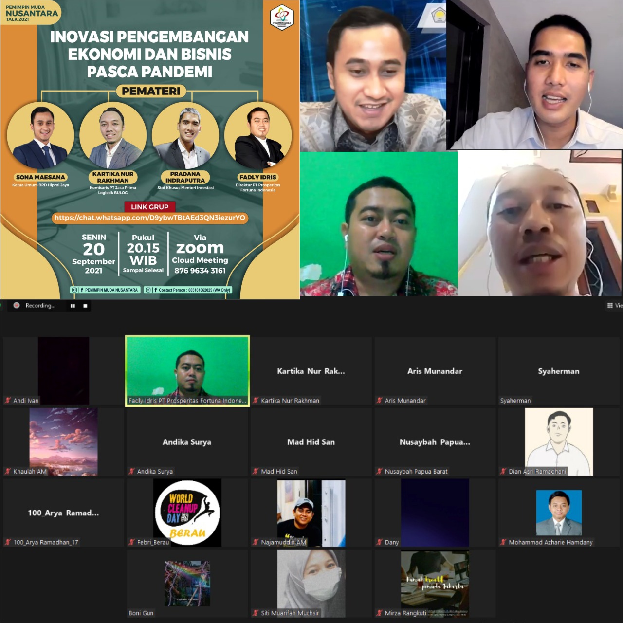 Jakarta – SerikatNasional.id | Pemimpin Muda Nusantara menggelar webinar dengan tema “Inovasi Pengembangan Ekonomi dan Bisnis pasca Pandemi ”, Senin Malam (20/9/2021). Dihadiri puluhan pelaku bisnis, wirausaha, pemuda, dan mahasiswa yang antusias dalam diskusi.
