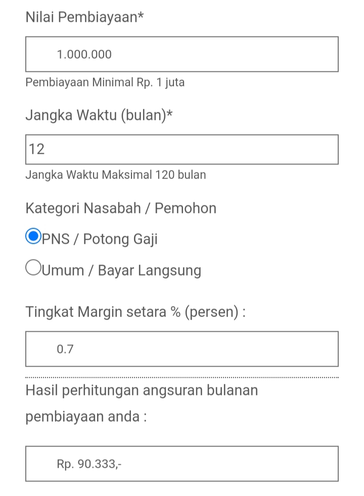 Kalkulasi ini merupakan perkiraan nilai angsuran pembiayaan, dengan tingkat margin yang telah disetarakan dalam % (persen) dan dapat berubah sewaktu-waktu.