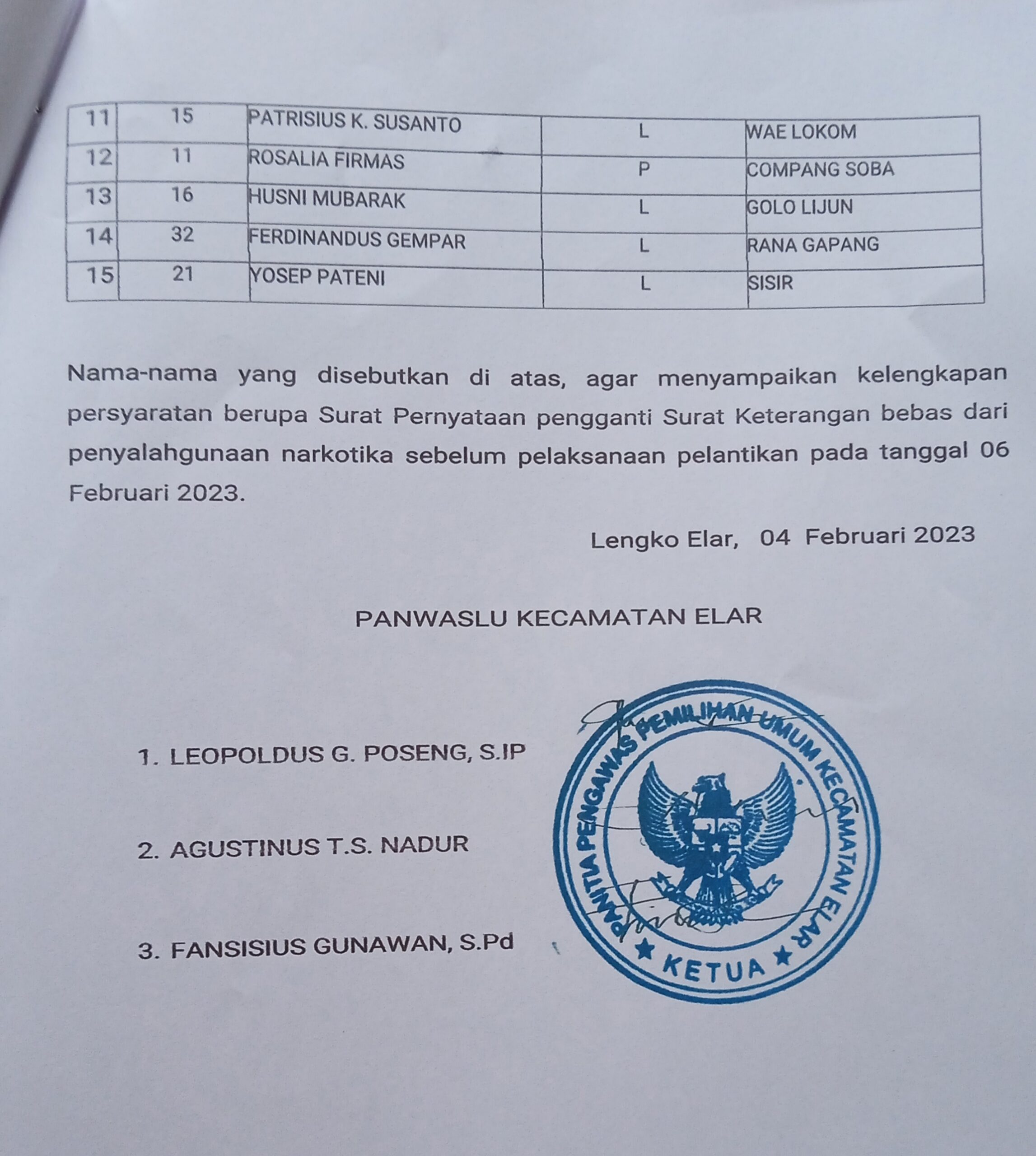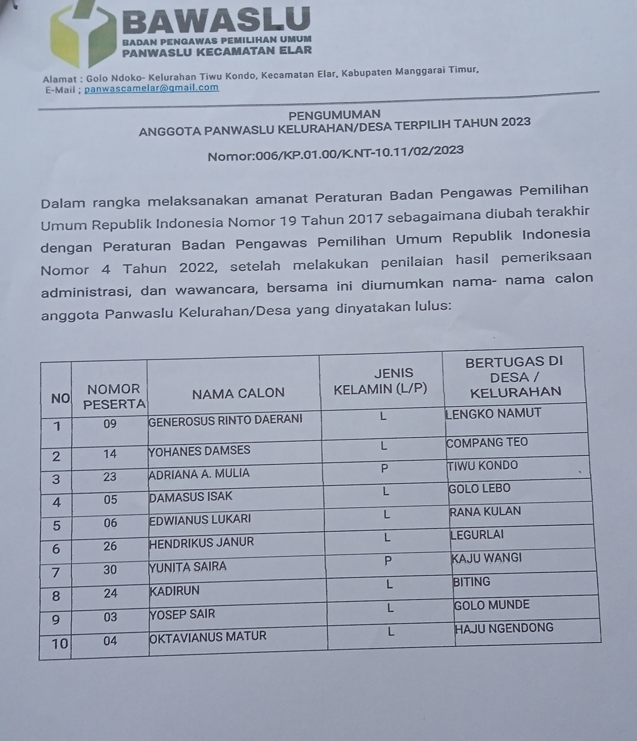 BORONG – Panitia Pengawas Pemilihan Umum Kecamatan Elar, Kabupaten Manggarai Timur resmi mengumumkan anggota terpilih panwaslu kelurahan/desa Kecamatan Elar pada, Sabtu (04/02/2023).