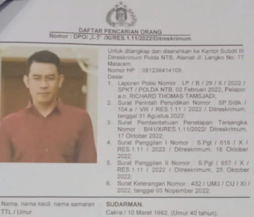 Mataram – Direktorat reserse kriminal umum (Ditreskrimum) Polda NTB saat ini sedang memburu seorang pria bernama Sudarman (40) warga Jalan Gora, Gang Melon , Lingkungan Sindu, Kelurahan Cakranegara Utara, Kecamatan Cakranegara, Kota Mataram karena di duga terlibat dalam kasus penipuan dan atau penggelapan dalam jabatan.